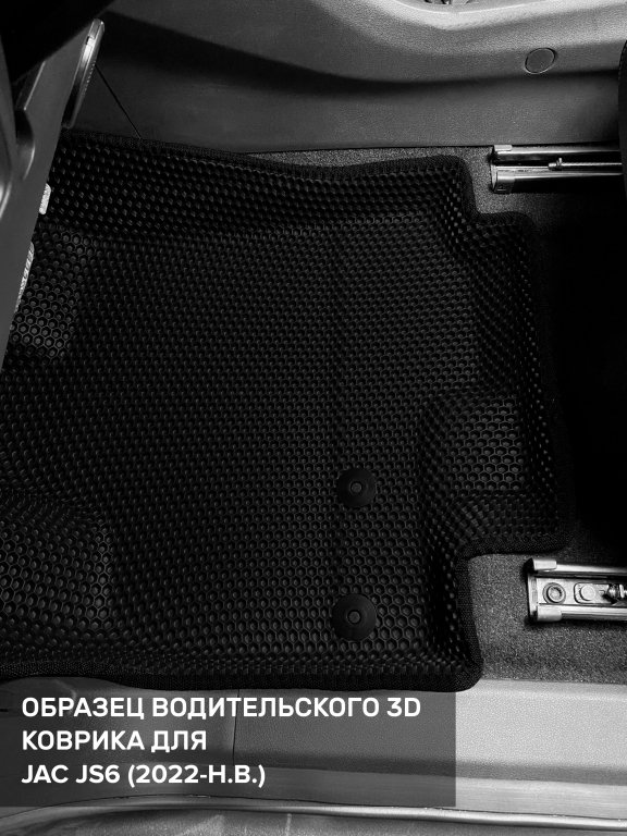 Автомобильные 3д коврики для JAC JS6 (2022-н.в) в салон авто и багажник сделаны из инновационного полимерного материала EVA, изысканная структура в виде ячеек не дает воде, пыли и снегу разлетаться по салону машины и багажнику. 3д коврики зафиксированы на полу определенными клипсами, соответствующими JAC JS6 (2022-н.в), и не двигаются в процессе езды.